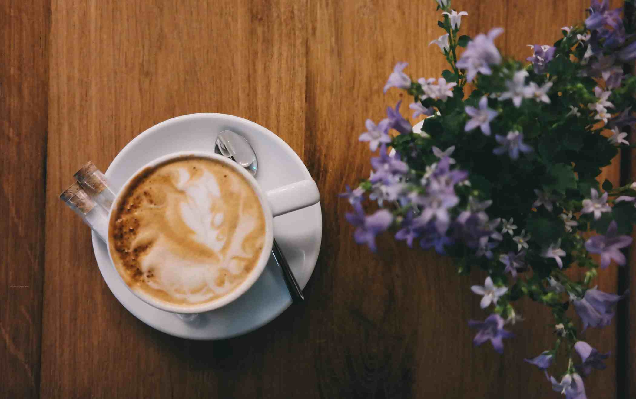 Cup of hot foamy cappuccino next to some purple flowers 5k UHD Wallpaper